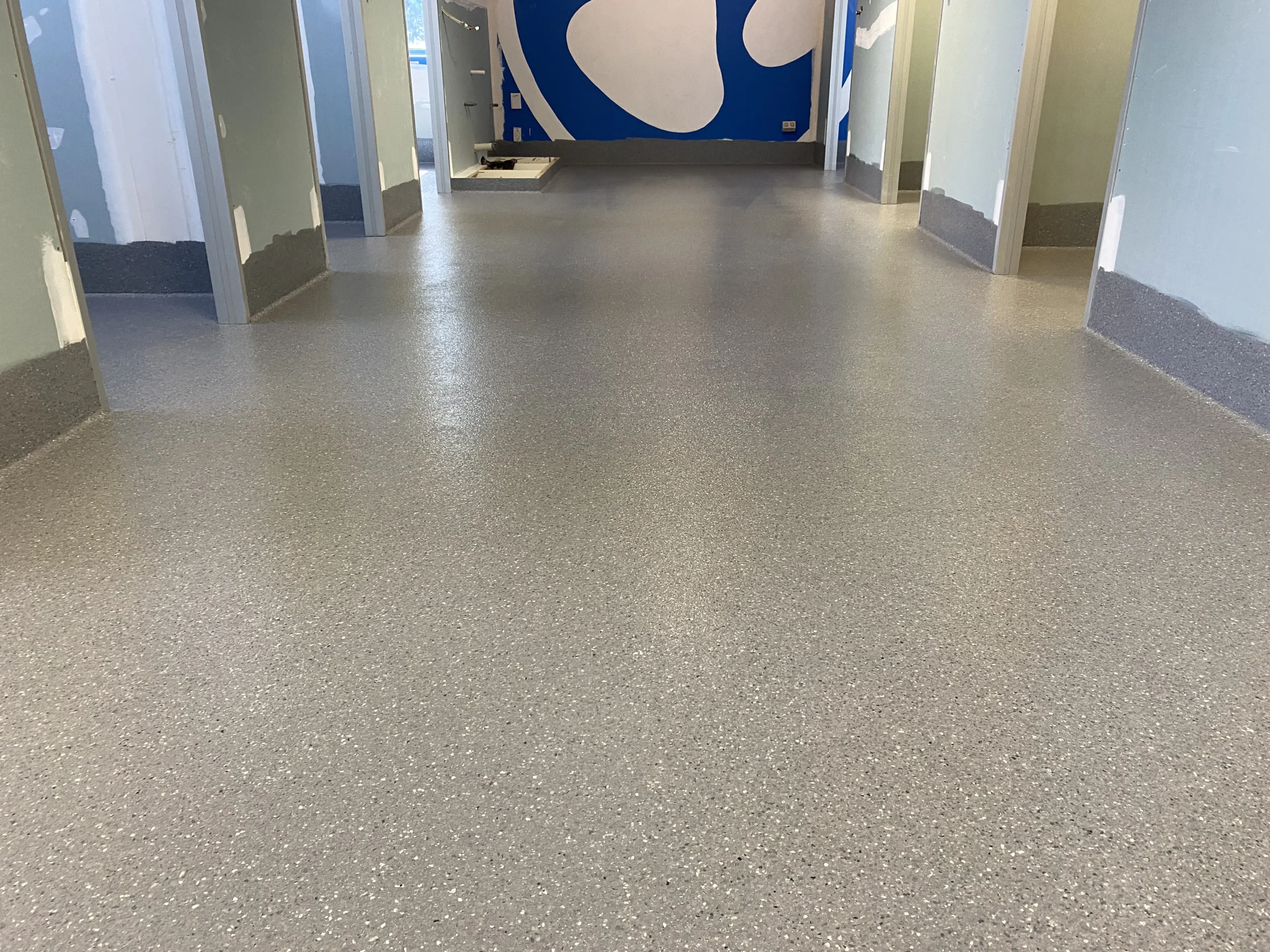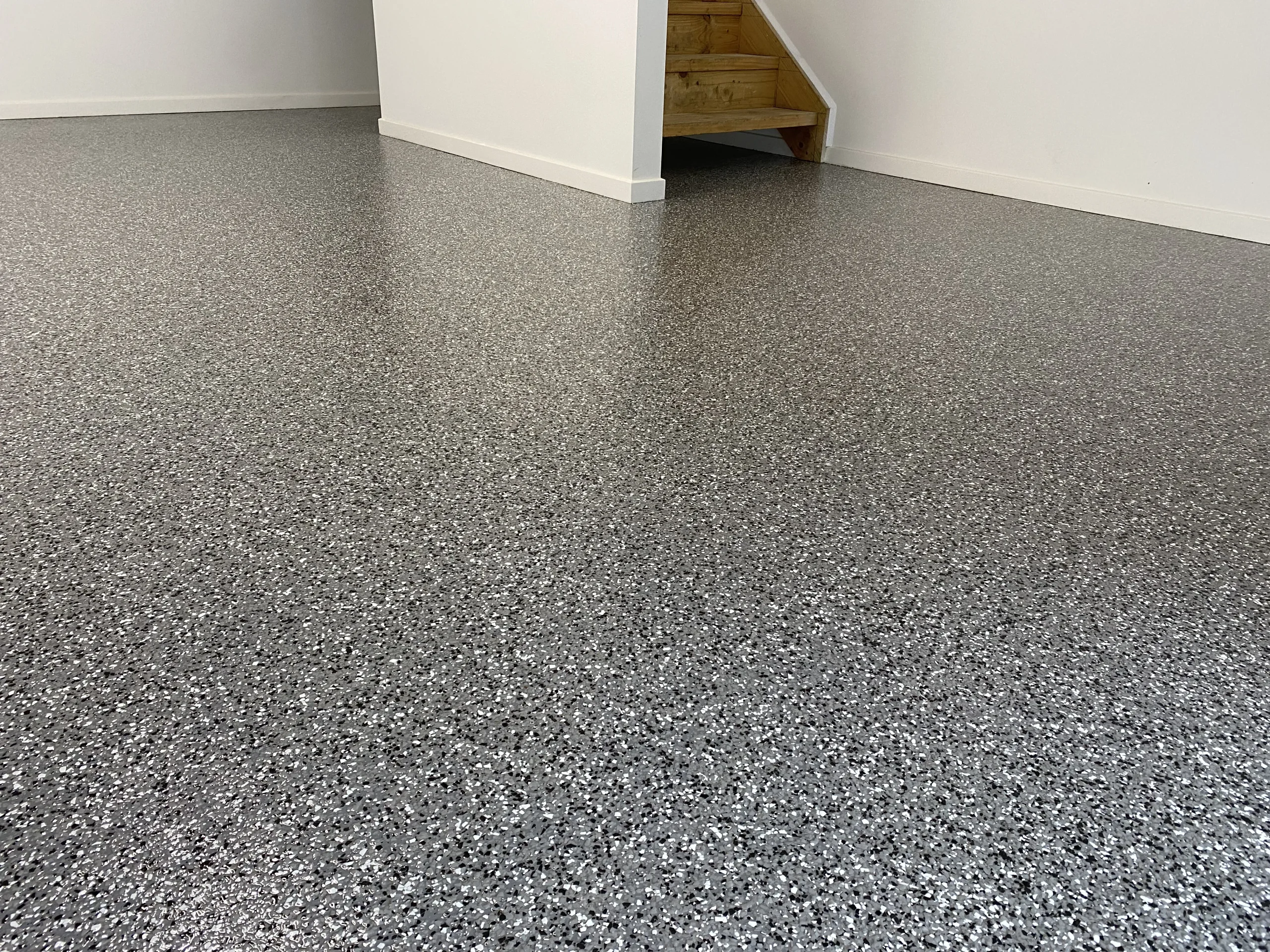 Vinyl flake flooring is a two-part flooring system with the decorative flakes in between the bottom coat and shiny topcoat. Often our customers refer to as epoxy flooring, or by other names like epoxy flake flooring, concrete resin coating, paint flake concrete flooring, vinyl chip flooring, metallic flakes epoxy, polished concrete flakes, decorative vinyl flakes, two-pack epoxy resin, polymer flake flooring, decorative concrete sealing but whatever name you know it by Allgrind do it best.